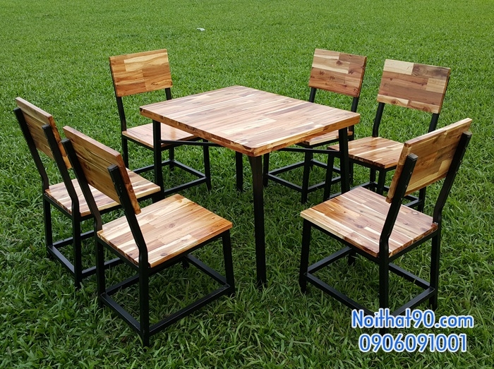 Chất liêu: Khung ghế được làm từ sắt 100% - qua xử lý sơn tĩnh điện + mặt ghế, mặt bàn bằng gỗ tự nhiên.