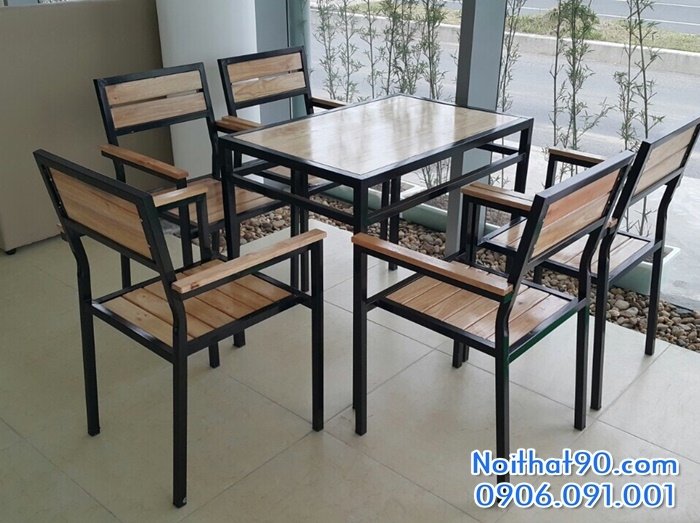 Chất liêu: Khung ghế được làm từ sắt 100% - qua xử lý sơn tĩnh điện + mặt ghế, mặt bàn bằng gỗ tự nhiên.